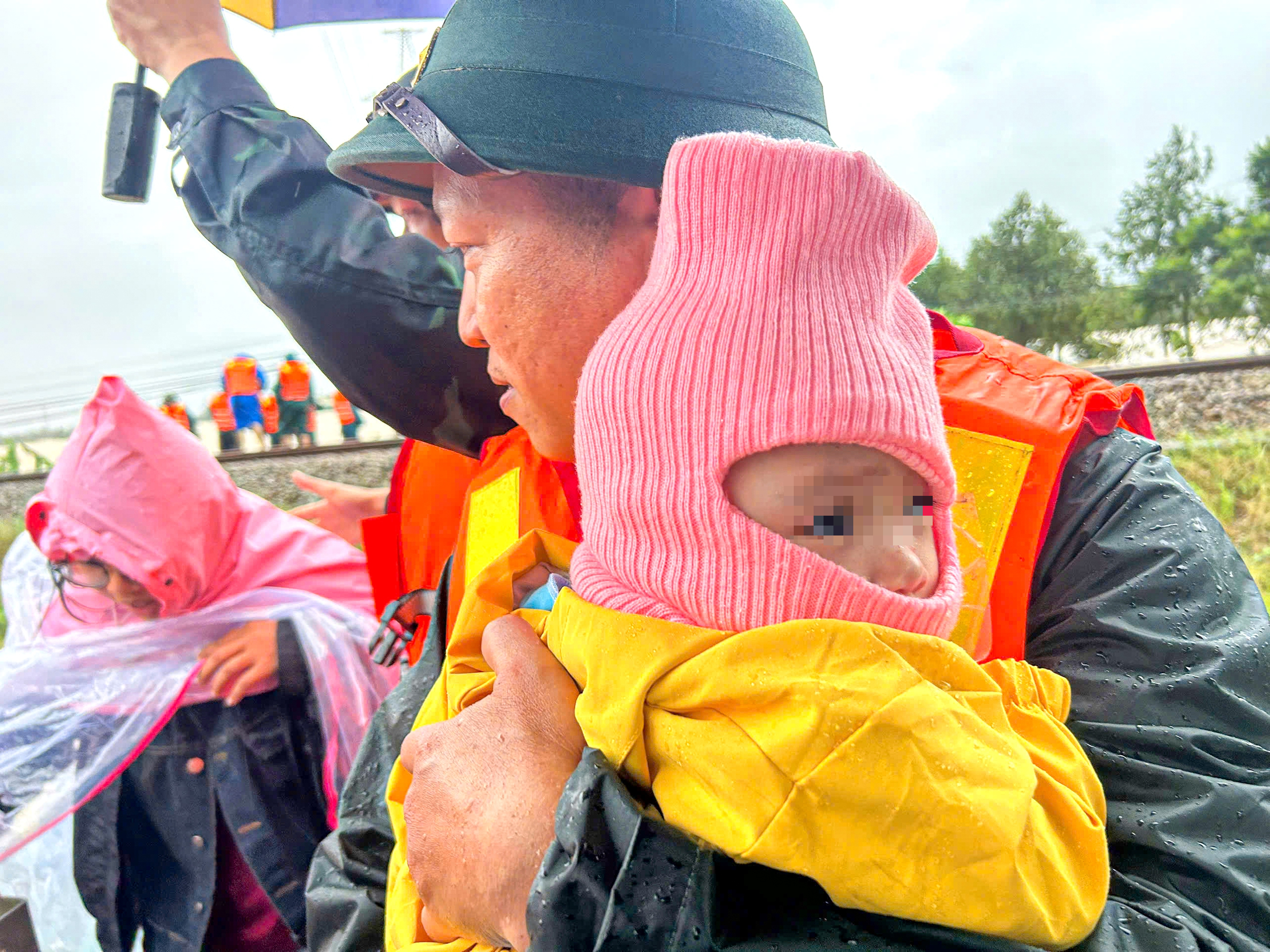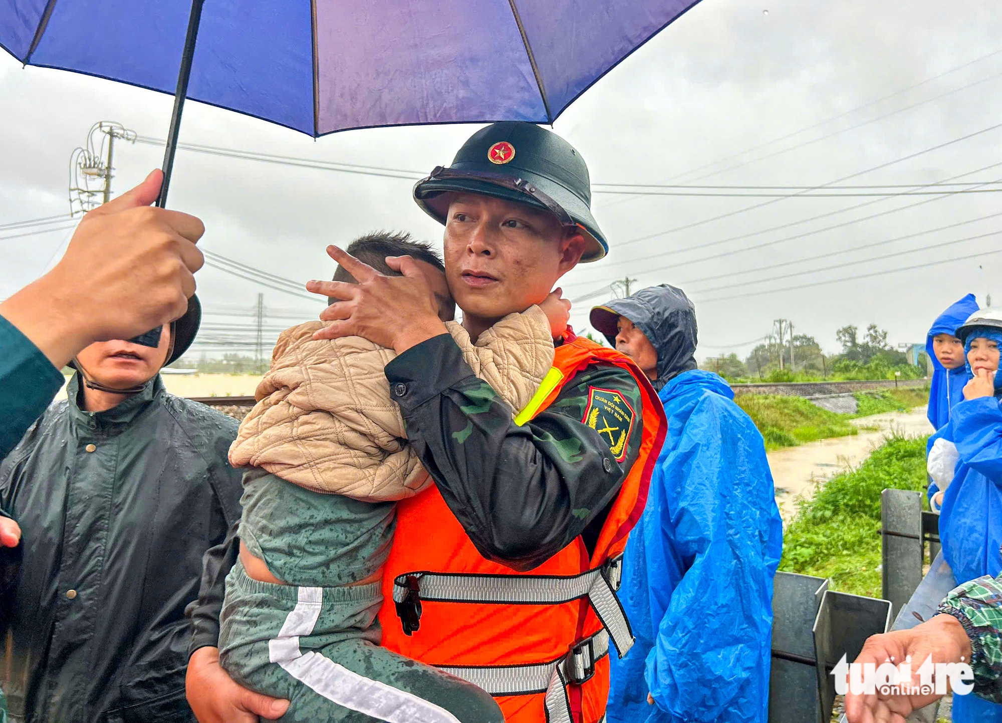Cán bộ, chiến sĩ chăm sóc các em nhỏ trong khi chờ người thân được đưa đến nơi an toàn - Ảnh: THANH NGUYÊN