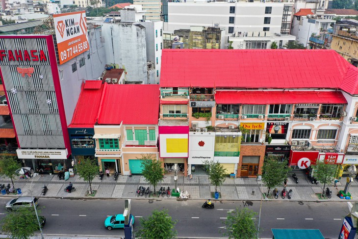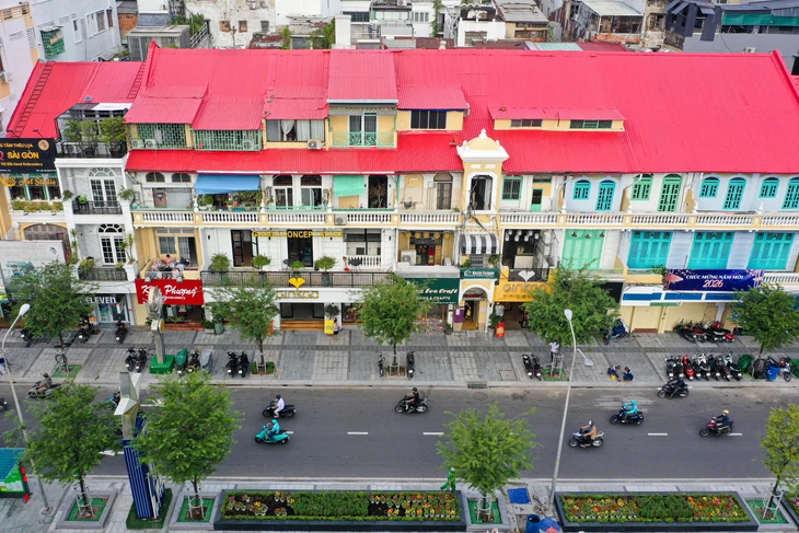 Những mái nhà đỏ rực, mới tinh đã thay chỗ lớp sơn bạc màu trên những ngôi nhà dọc tuyến Lê Lợi, đoạn từ đường Pasteur đến Nam Kỳ Khởi Nghĩa - Ảnh: MINH HÒA - TRÍ ĐỨC